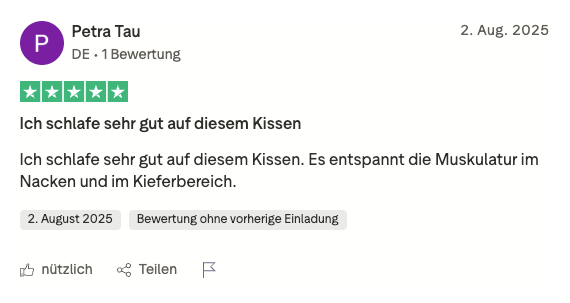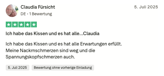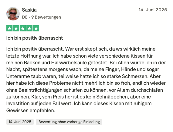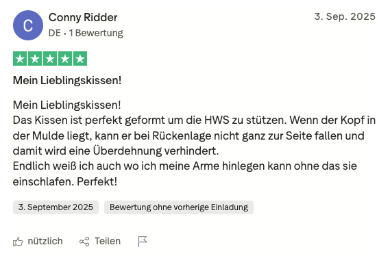 Direkt nach dem ersten Gebrauch waren die Nackenschmerzen besser, im Laufe einer Woche war ich fast schmerzfrei. Das Kissen unterstützt den Kopf-Hals-Bereich optimal und in jeder Position, es ist eine perfekte Mischung - gemütlich und weich einerseits und bietet die notwendige Unterstützung und Entlastung andererseits.